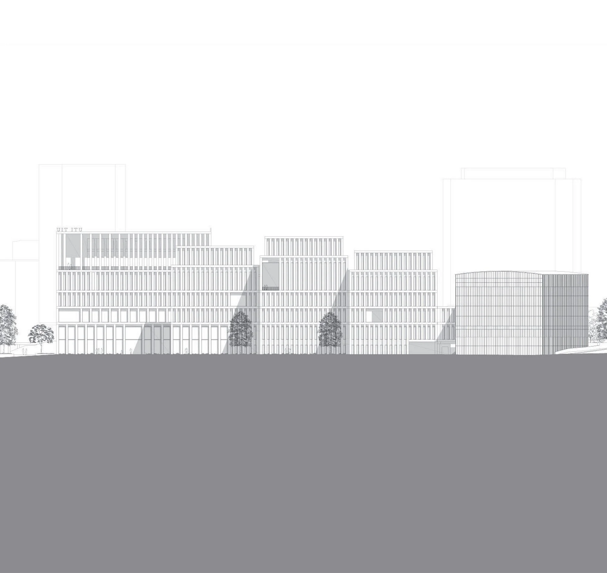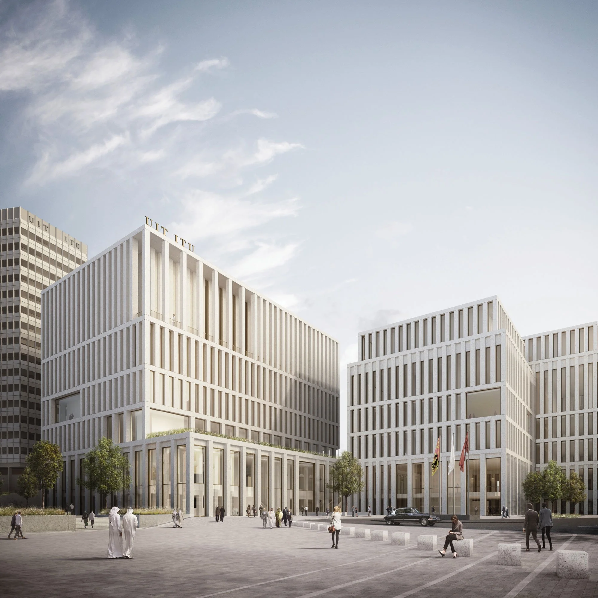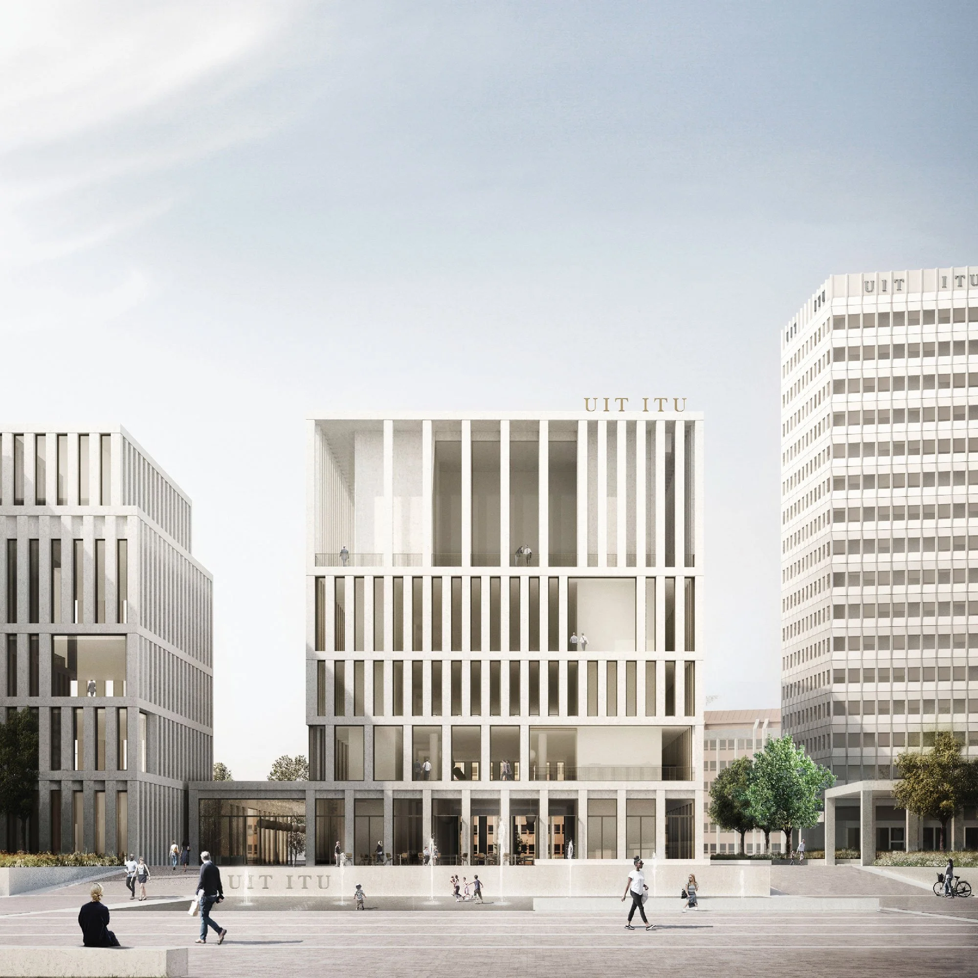 The proposal for the redevelopment of the ITU Headquarters Campus was conceived as a composition of elements set within the reconfigured esplanade that emanates southwards from the Allée des Nations. These buildings are divided programmatically and physically into two distinct entities, the administrative buildings and the conference building. The scheme proposed a vision for the wider area, looking beyond the confines of the site boundary to indicate how the campus could be better integrated into the fabric of the city.