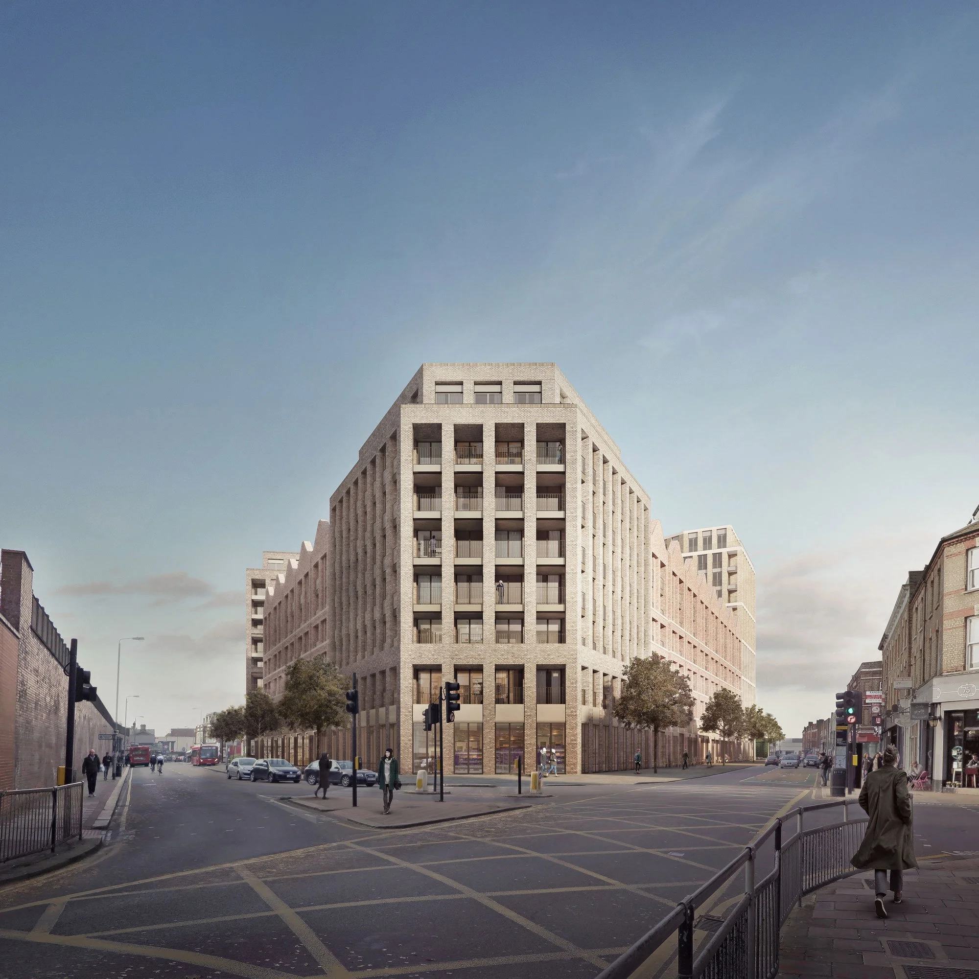 The proposals seek to restore the streetscape that once existed on the site, with predominantly six storey terraces above shopfronts to all three sides, whilst buildings of 8, 10 and 14 storeys mark the three corners to create a clear hierarchy of built form in the townscape.